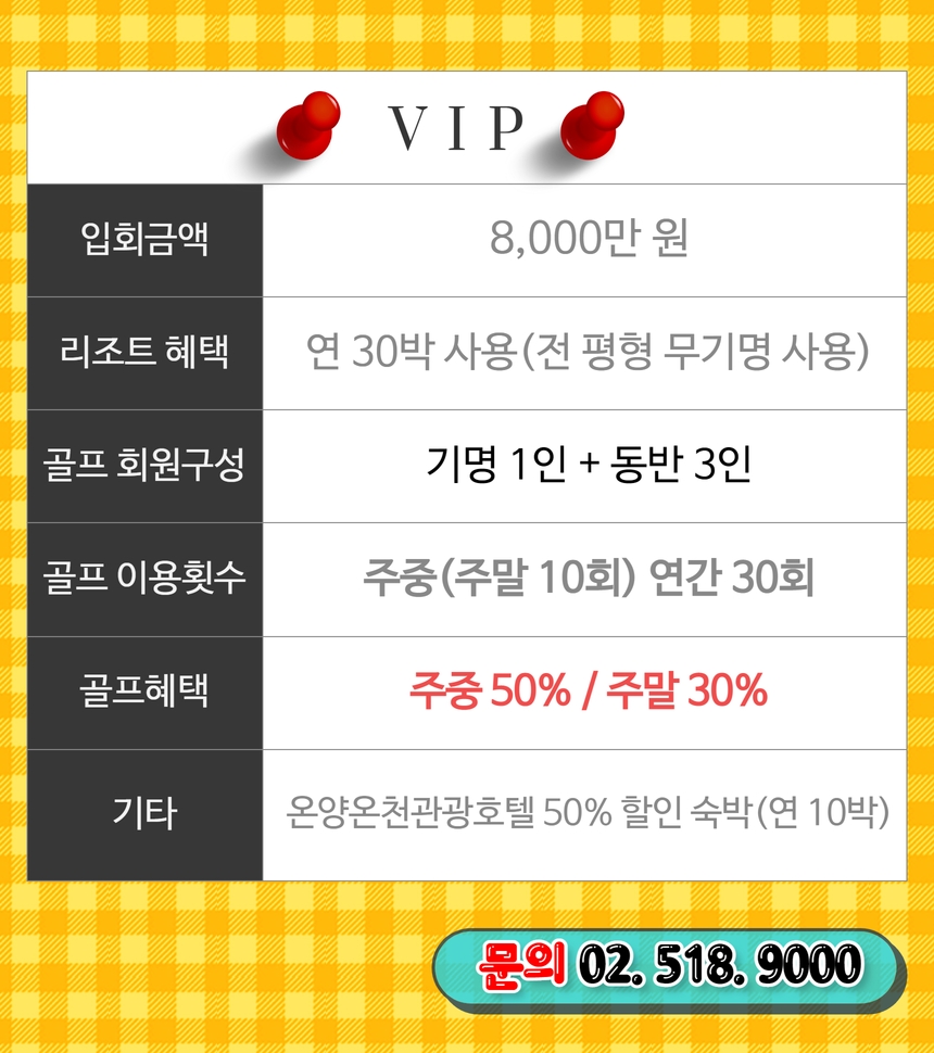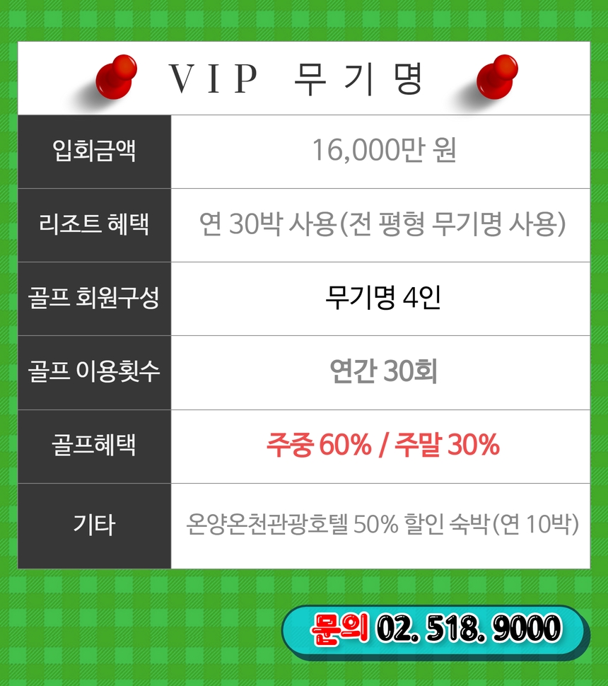 상품은 골드, VIP, VIP 무기명 3가지 상품이 있습니다. 위 내용을 보시면 아시겠지만~ 리조트 회원권이지만 골프회원권과 유사한 것을 볼 수 있습니다. 어떤 상품을 분양받아도 리조트 혜택은 동일하지만 골프혜택은 달라집니다.