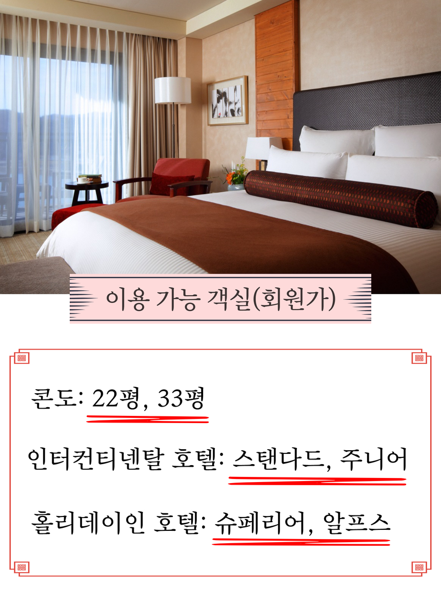 하프 통합회원권으로 숙박이(회원가) 가능한 객실은 홀리데이 인 스위트(콘도) 22평, 33평을 이용할 수 있습니다. 인터컨티넨탈 호텔은 스탠더드, 주니어 스위트를 이용할 수 있습니다. 그리고 홀리데이 인 리조트(호텔)는 슈페리어, 알프스 스위트 객실을 이용할 수 있습니다.