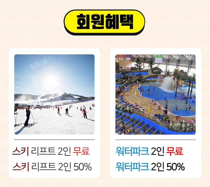 다음으로 부대시설 할인을 살펴보겠습니다. 먼저 스키 리프트 2인 무료, 2인 50% 할인 혜택이 있습니다. 그리고 워터파크 2인 무료, 2인 50% 할인 혜택이 있습니다. 스키와 워터파크 혜택은 각 1일 기준입니다.